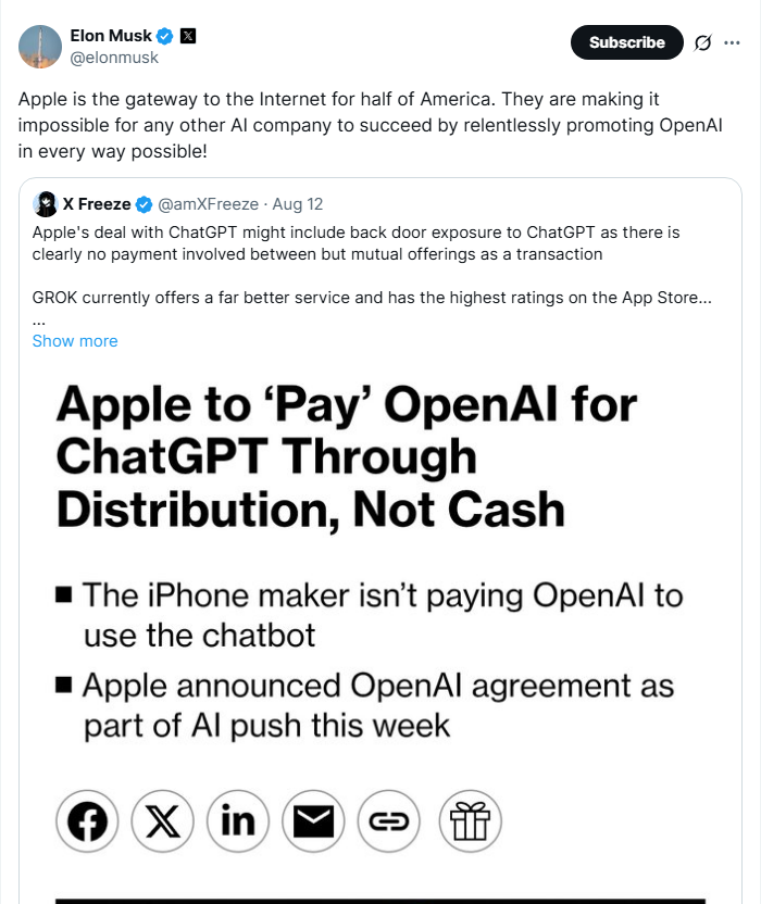 In a recent tweet, Musk stated, “Apple is the gateway to the Internet for half of America. They are making it impossible for any other AI company to succeed by relentlessly promoting OpenAI in every way possible!”