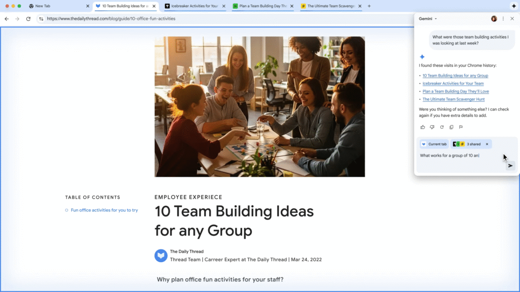 With the new update, you can ask Gemini to look at all your open tabs and make sense of them. For example, you could ask, “Based on my open tabs for my trip, create a simple itinerary for me” or “Compare the reviews of these three products I have open.”