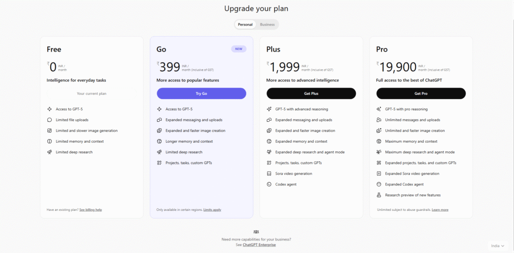 That’s why people upgrade to paid plans. Paid plans give you access to a more powerful “brain” (a more advanced AI model), faster response times, and extra features. Until now, the main paid plan in India was “ChatGPT Plus,” which costs around ₹1,999 per month a steep price for many.
