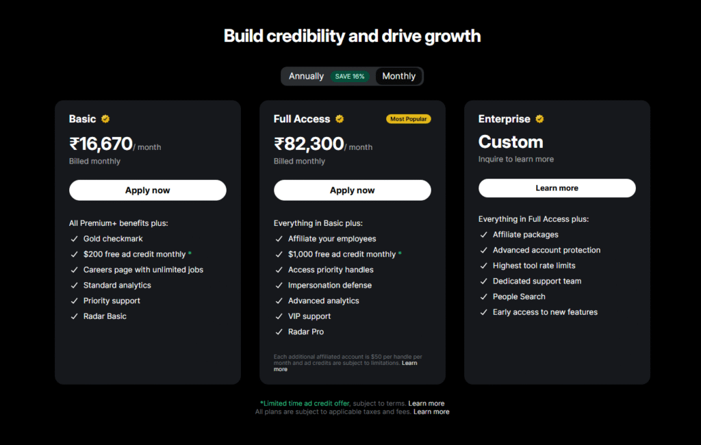 To help you get started, X is even offering up to $12,000 in free ad credits for businesses that sign up for a yearly plan.